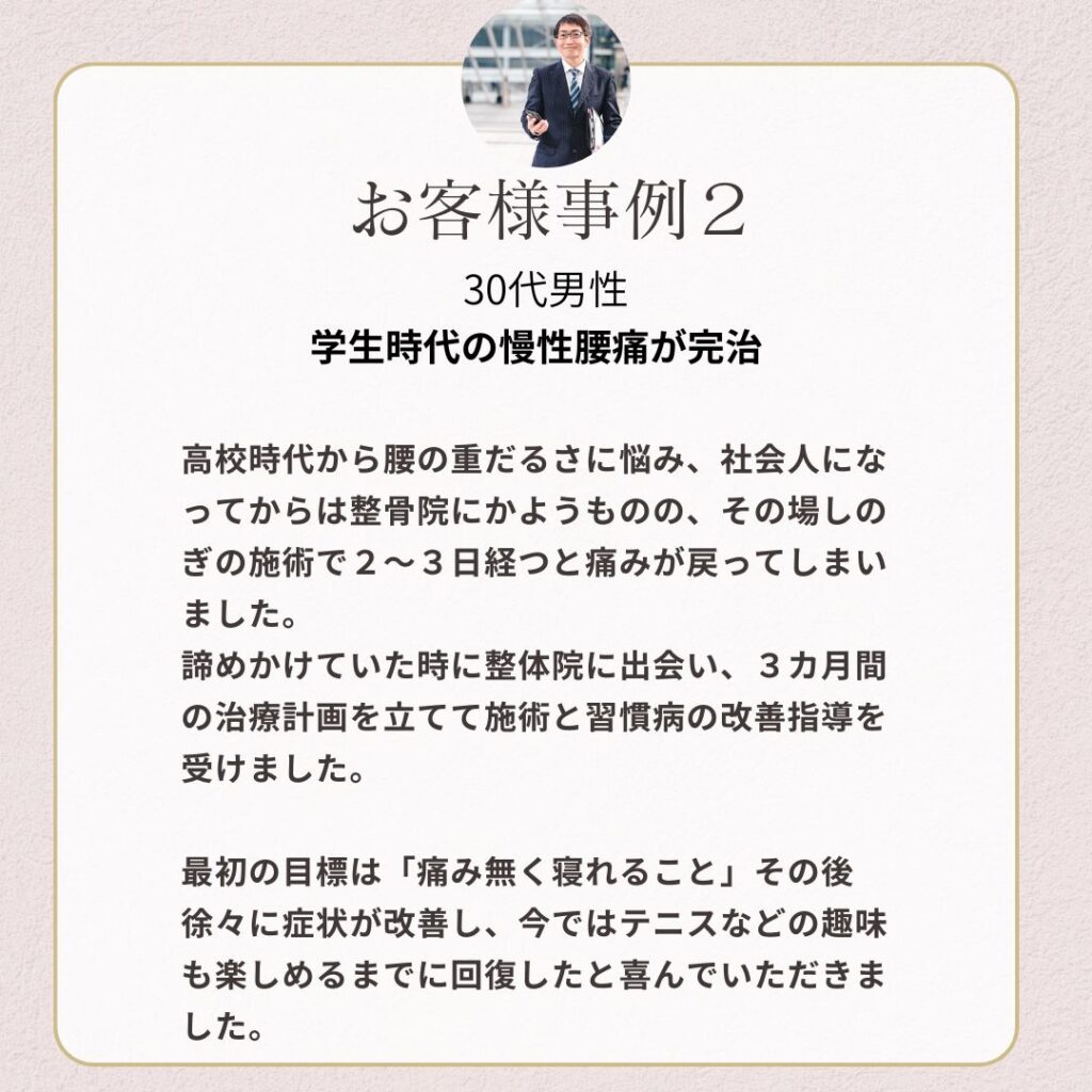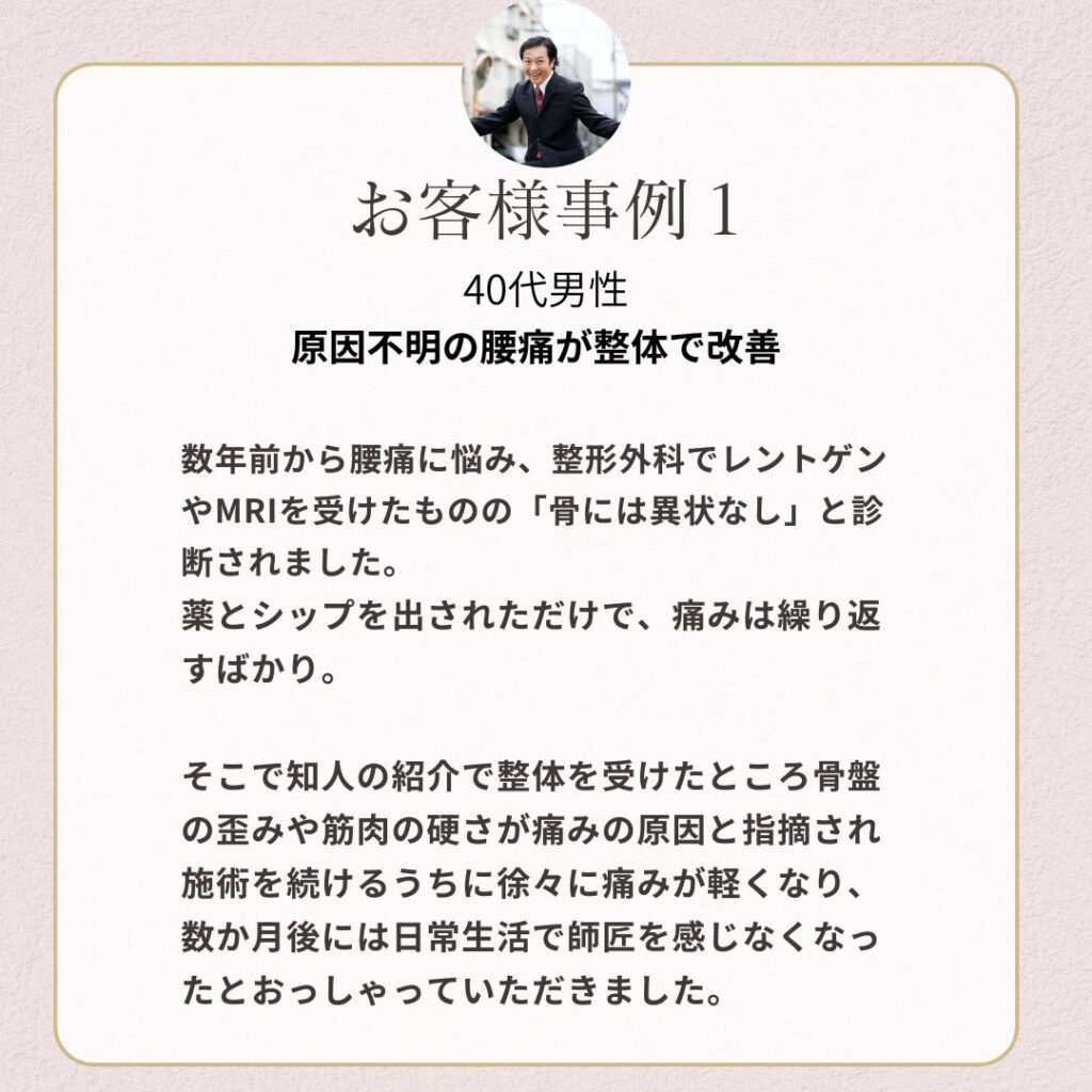 整形外科、整骨院どこに行っても改善しない慢性痛が最短1回で効果が実感できる